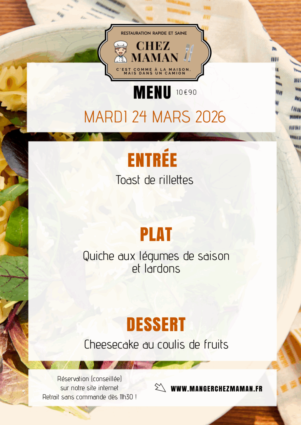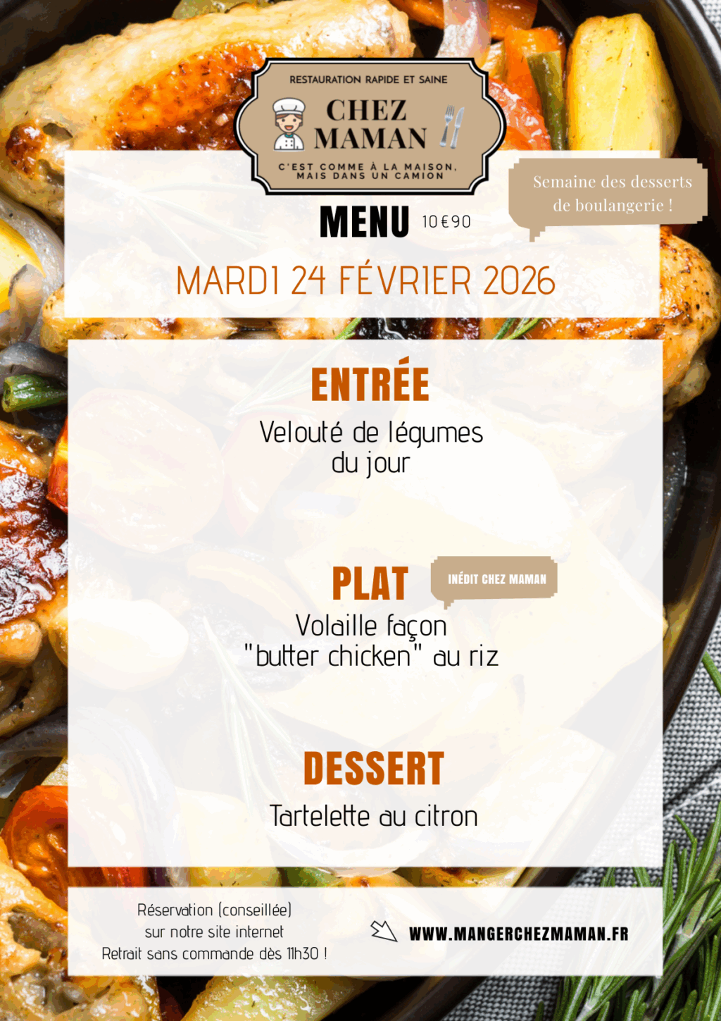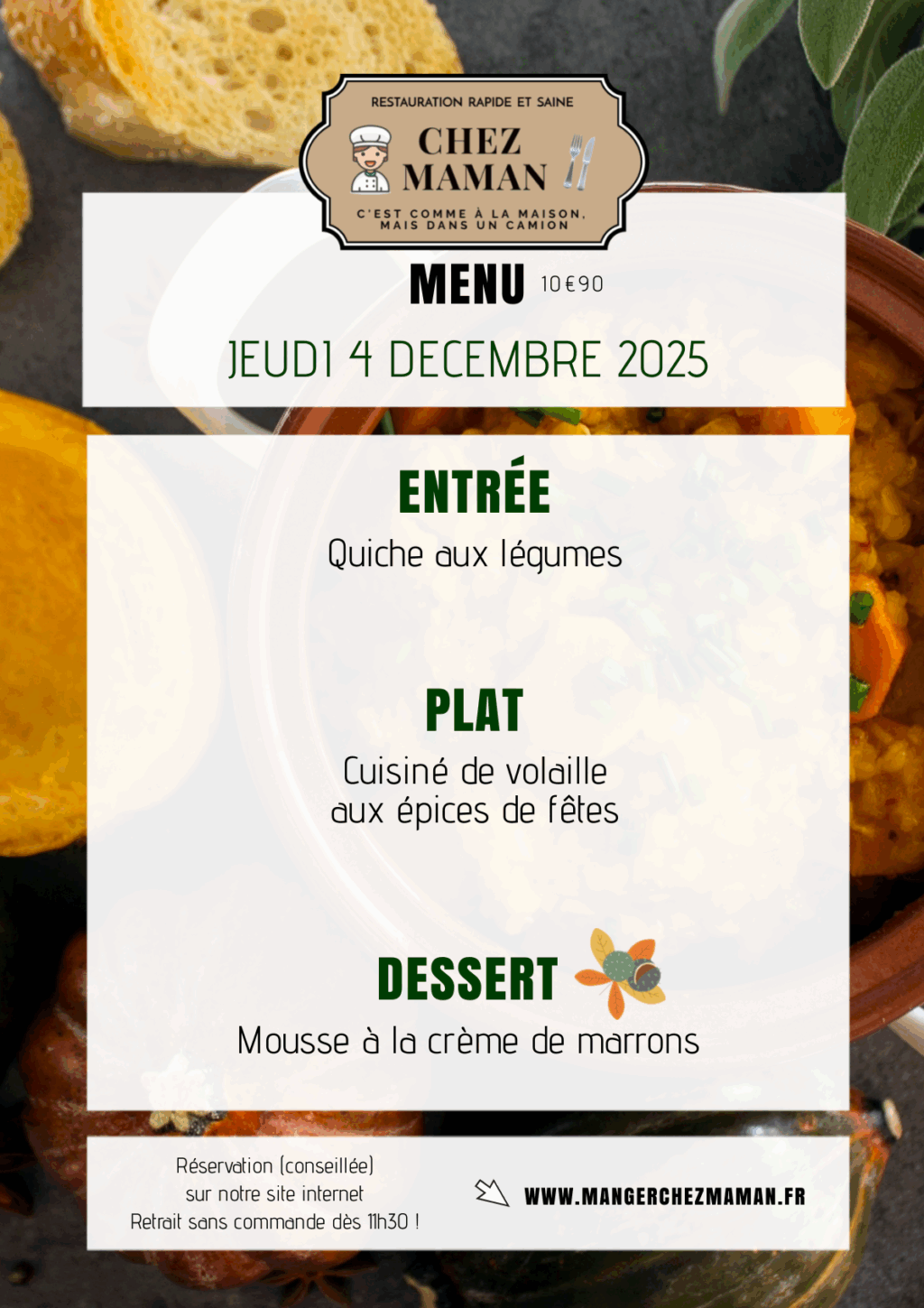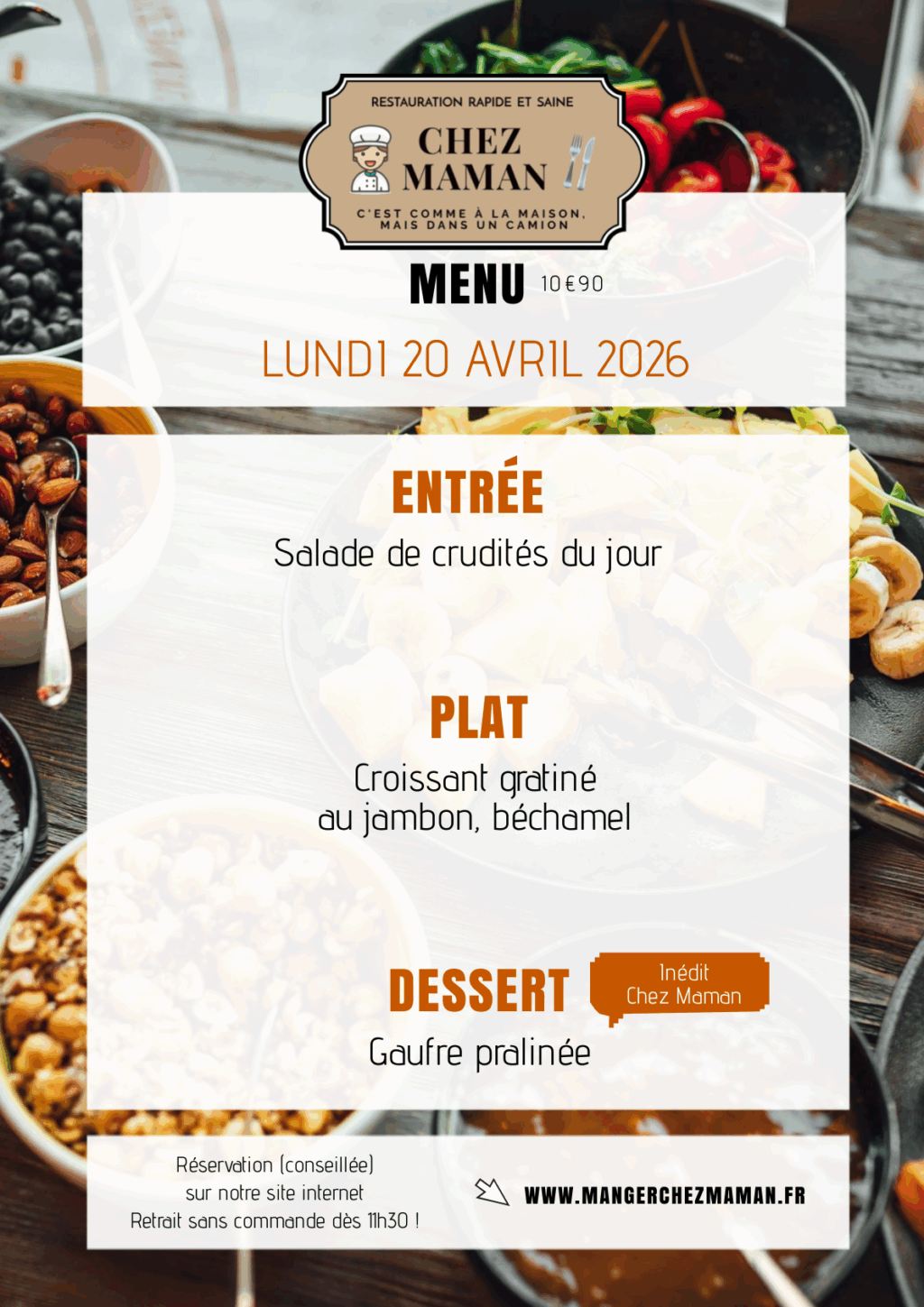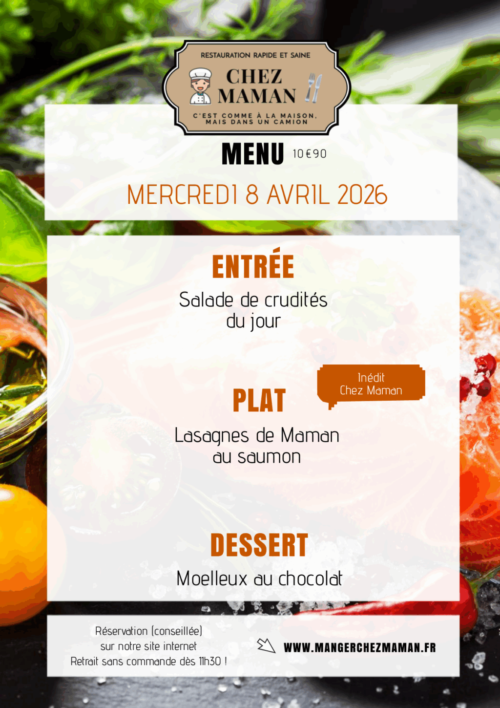 Chaque jour du lundi au vendredi, un nouveau menu « entrée + plat + dessert » vous est proposé au tarif de 10€90 TTC. Chez Maman, c’est aussi une cuisine savoureuse, généreuse et remplie d’amour… Au plaisir de vous faire découvrir notre univers !Murielle, 60 ans, assistante maternelle pendant 17 années et passionnée de cuisine est la fondatrice de Chez Maman. À la suite de la crise sanitaire de 2020, son travail est à l’arrêt complet durant plusieurs mois. À la recherche d’une reconversion avec l’envie de changer de domaine, elle décide de se lancer dans la cuisine en développant un concept de restauration rapide mais saine auquel elle pensait depuis plusieurs années.