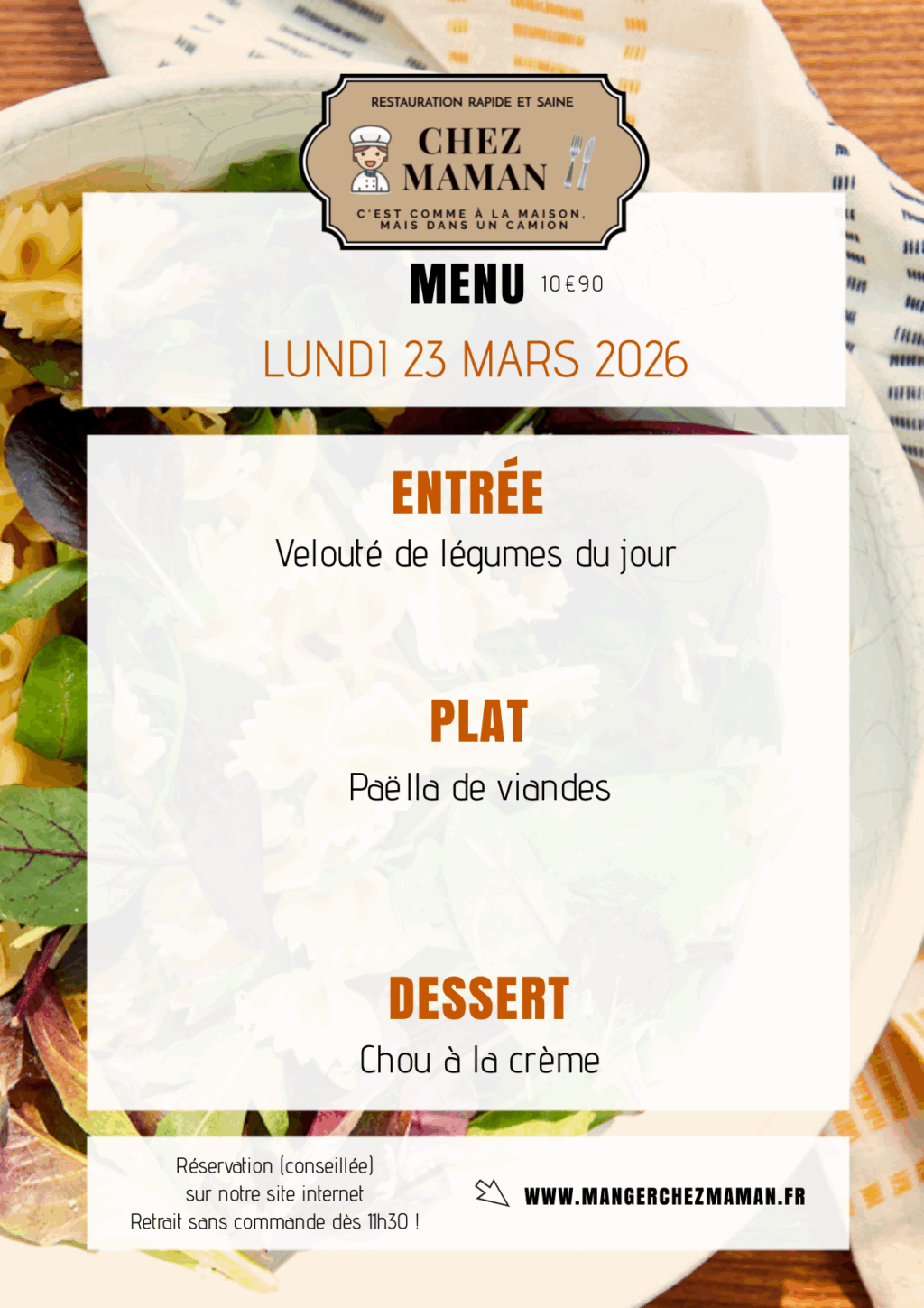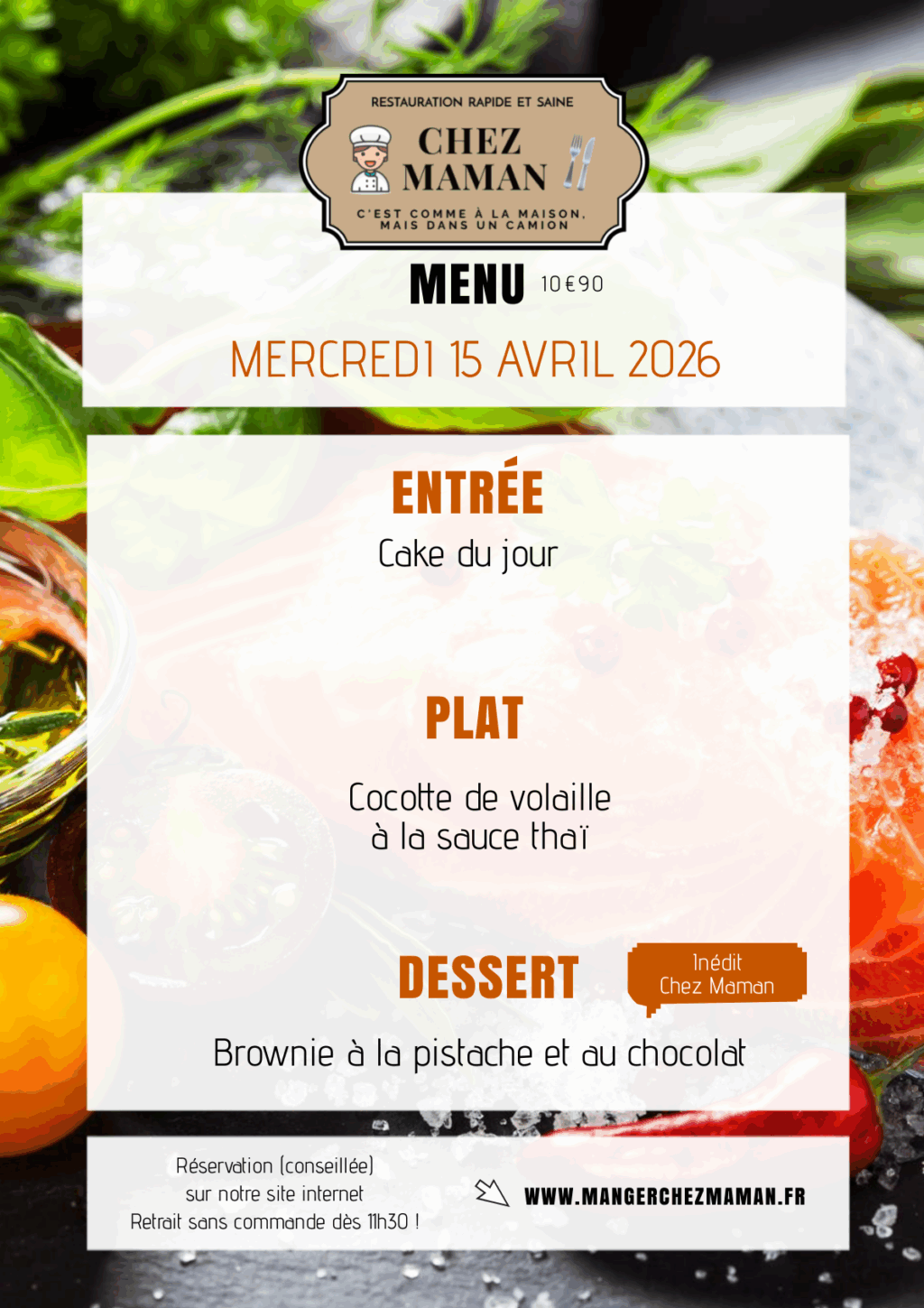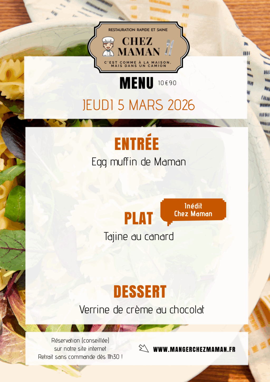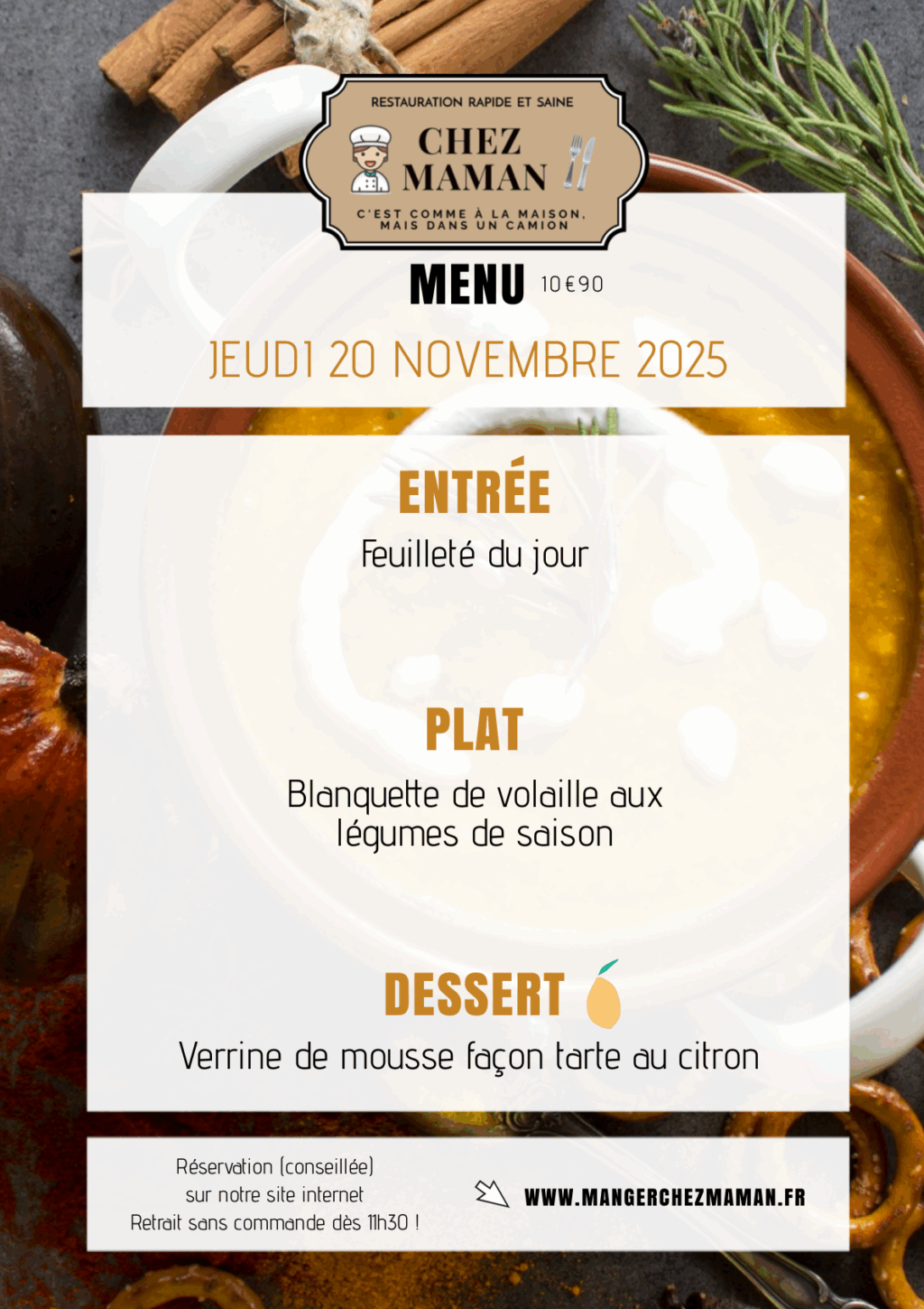 Chaque jour du lundi au vendredi, un nouveau menu « entrée + plat + dessert » vous est proposé au tarif de 10€90 TTC. Chez Maman, c’est aussi une cuisine savoureuse, généreuse et remplie d’amour… Au plaisir de vous faire découvrir notre univers !Murielle, 60 ans, assistante maternelle pendant 17 années et passionnée de cuisine est la fondatrice de Chez Maman. À la suite de la crise sanitaire de 2020, son travail est à l’arrêt complet durant plusieurs mois. À la recherche d’une reconversion avec l’envie de changer de domaine, elle décide de se lancer dans la cuisine en développant un concept de restauration rapide mais saine auquel elle pensait depuis plusieurs années.