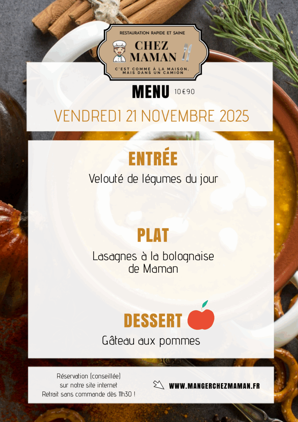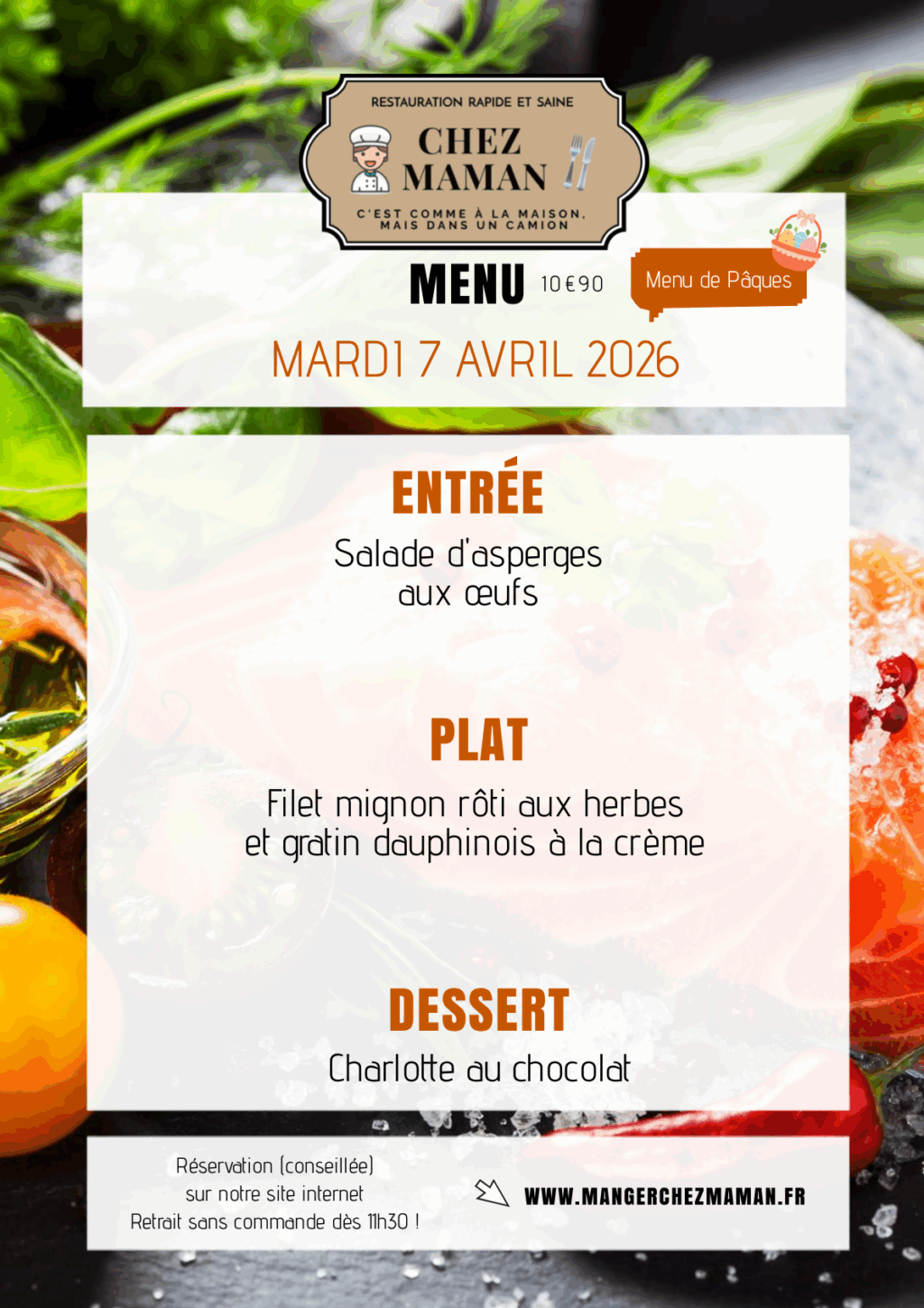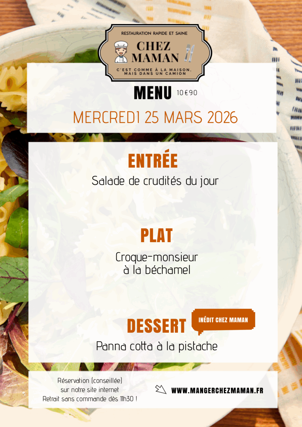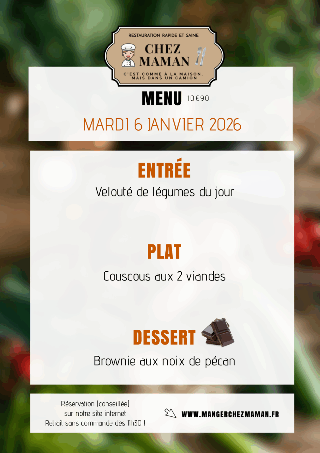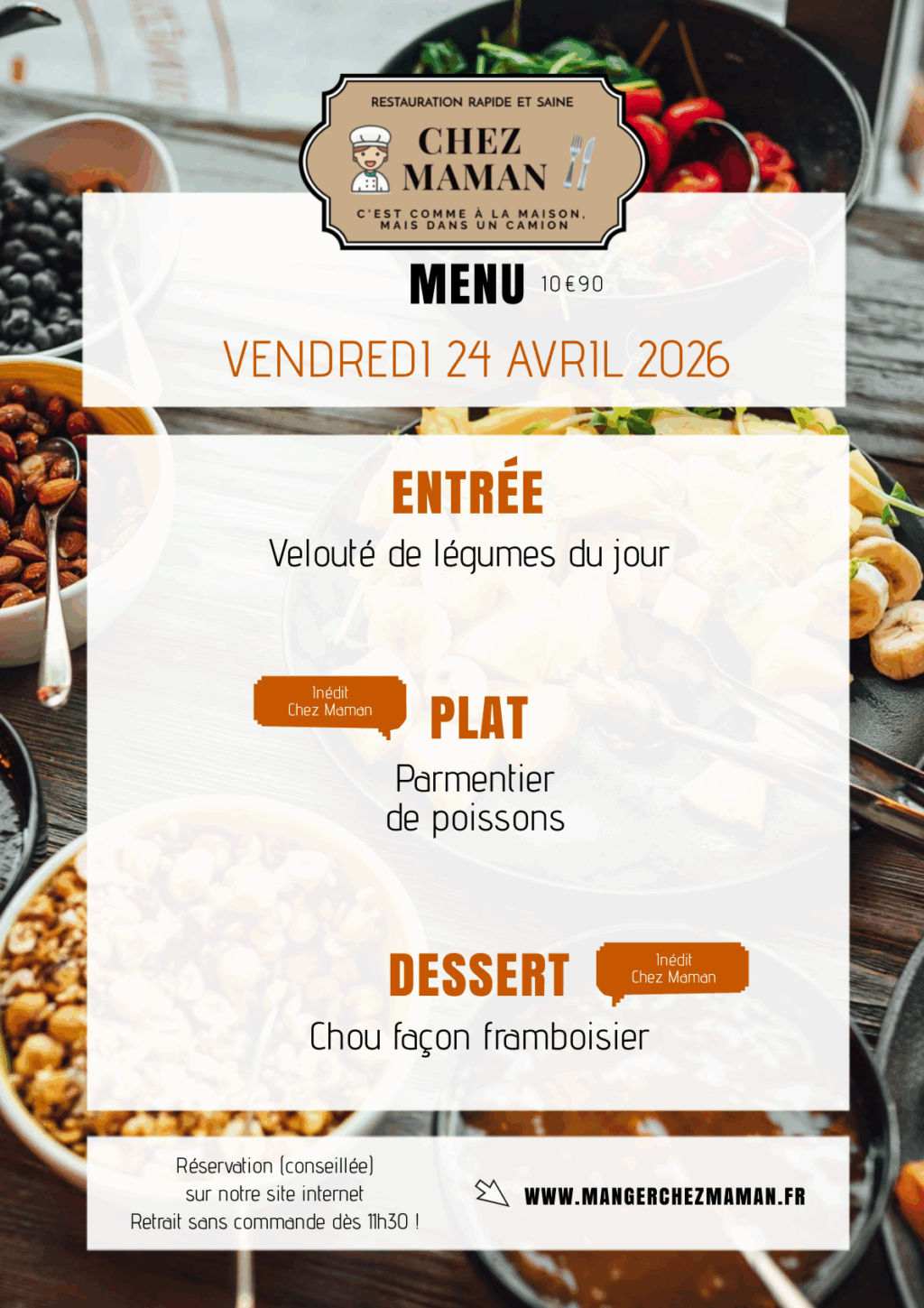 Chaque jour du lundi au vendredi, un nouveau menu « entrée + plat + dessert » vous est proposé au tarif de 10€90 TTC. Chez Maman, c’est aussi une cuisine savoureuse, généreuse et remplie d’amour… Au plaisir de vous faire découvrir notre univers !Murielle, 60 ans, assistante maternelle pendant 17 années et passionnée de cuisine est la fondatrice de Chez Maman. À la suite de la crise sanitaire de 2020, son travail est à l’arrêt complet durant plusieurs mois. À la recherche d’une reconversion avec l’envie de changer de domaine, elle décide de se lancer dans la cuisine en développant un concept de restauration rapide mais saine auquel elle pensait depuis plusieurs années.