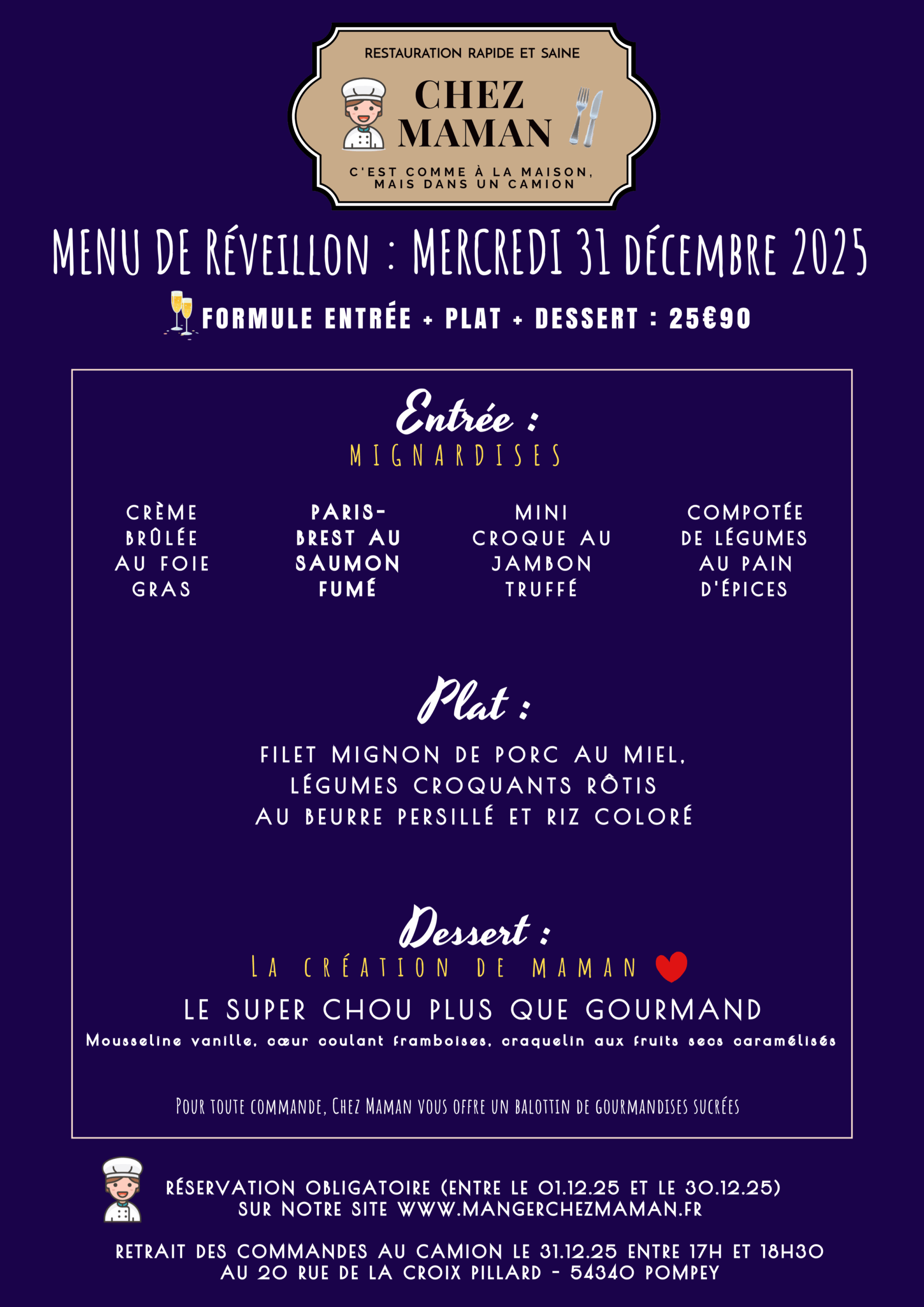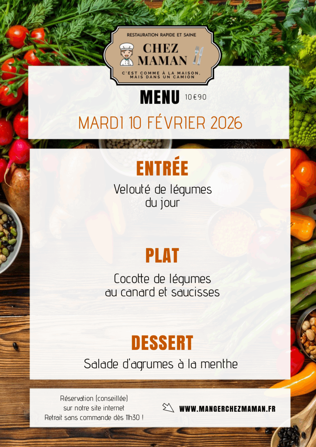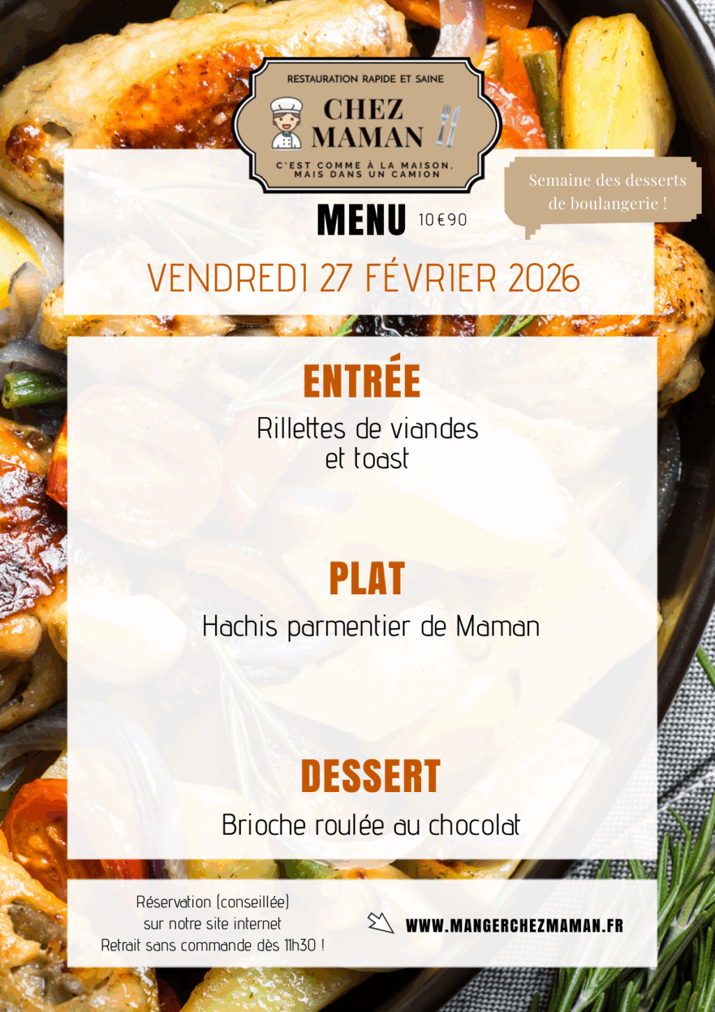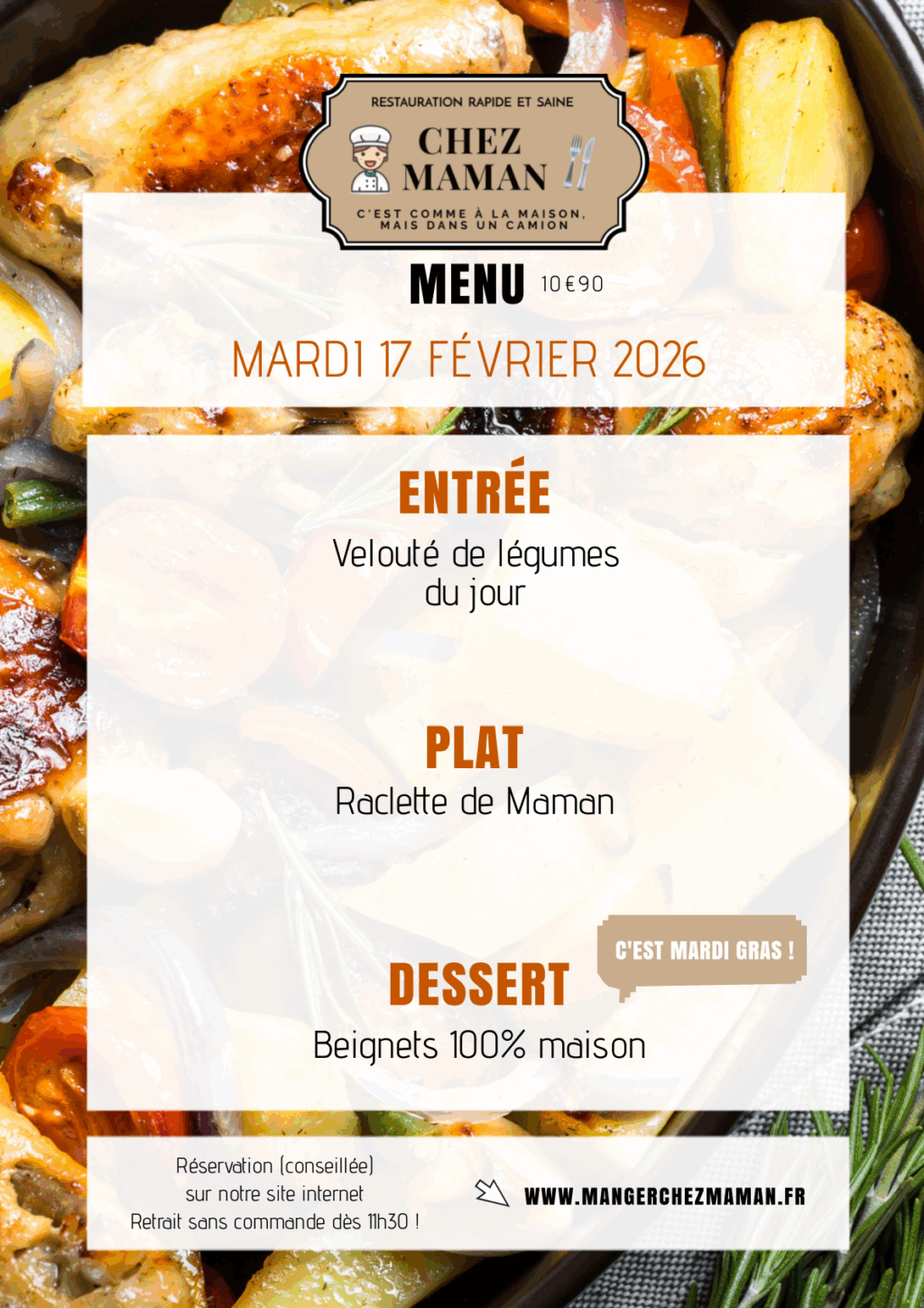 Chaque jour du lundi au vendredi, un nouveau menu « entrée + plat + dessert » vous est proposé au tarif de 10€90 TTC. Chez Maman, c’est aussi une cuisine savoureuse, généreuse et remplie d’amour… Au plaisir de vous faire découvrir notre univers !Murielle, 60 ans, assistante maternelle pendant 17 années et passionnée de cuisine est la fondatrice de Chez Maman. À la suite de la crise sanitaire de 2020, son travail est à l’arrêt complet durant plusieurs mois. À la recherche d’une reconversion avec l’envie de changer de domaine, elle décide de se lancer dans la cuisine en développant un concept de restauration rapide mais saine auquel elle pensait depuis plusieurs années.