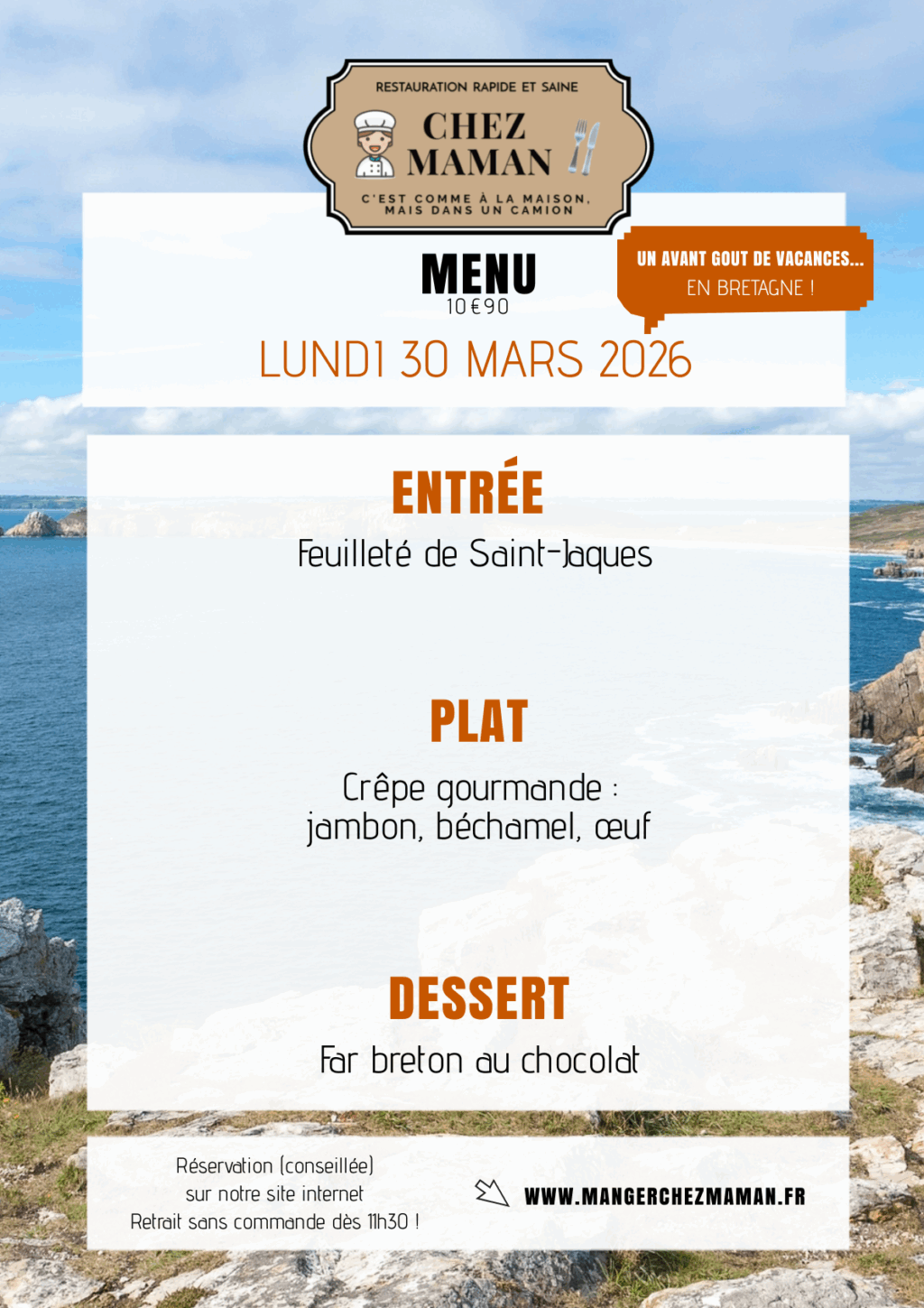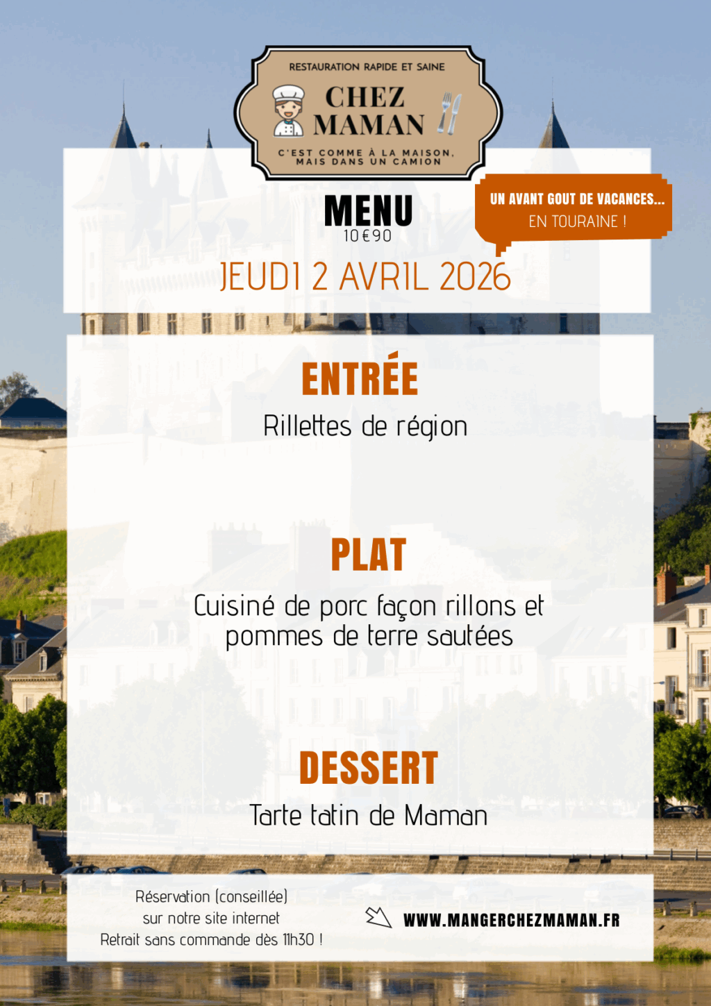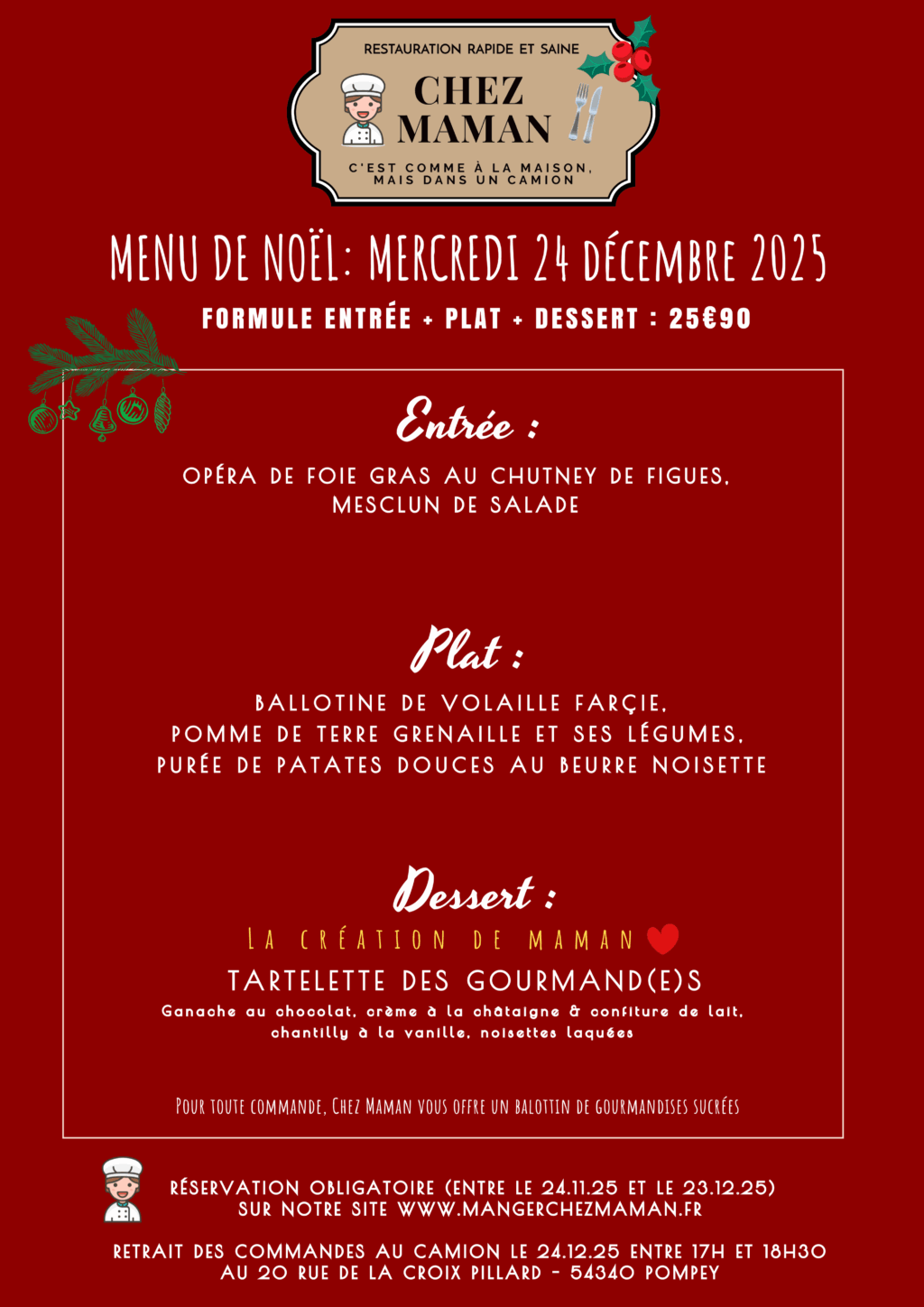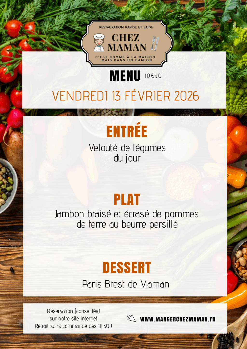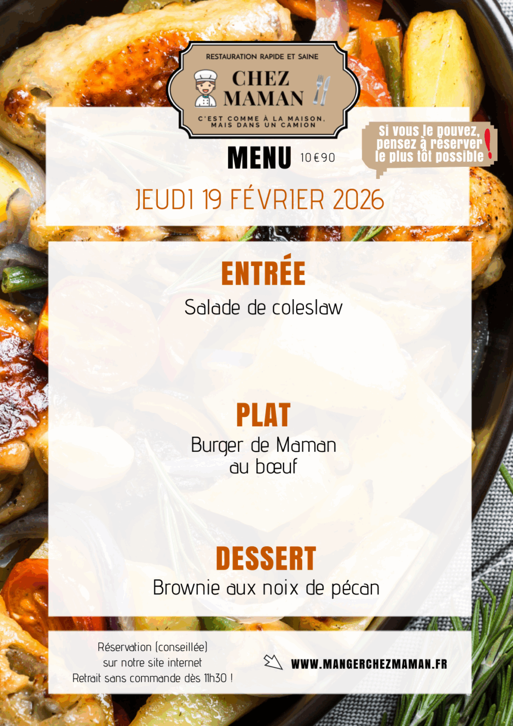 Chaque jour du lundi au vendredi, un nouveau menu « entrée + plat + dessert » vous est proposé au tarif de 10€90 TTC. Chez Maman, c’est aussi une cuisine savoureuse, généreuse et remplie d’amour… Au plaisir de vous faire découvrir notre univers !Murielle, 60 ans, assistante maternelle pendant 17 années et passionnée de cuisine est la fondatrice de Chez Maman. À la suite de la crise sanitaire de 2020, son travail est à l’arrêt complet durant plusieurs mois. À la recherche d’une reconversion avec l’envie de changer de domaine, elle décide de se lancer dans la cuisine en développant un concept de restauration rapide mais saine auquel elle pensait depuis plusieurs années.